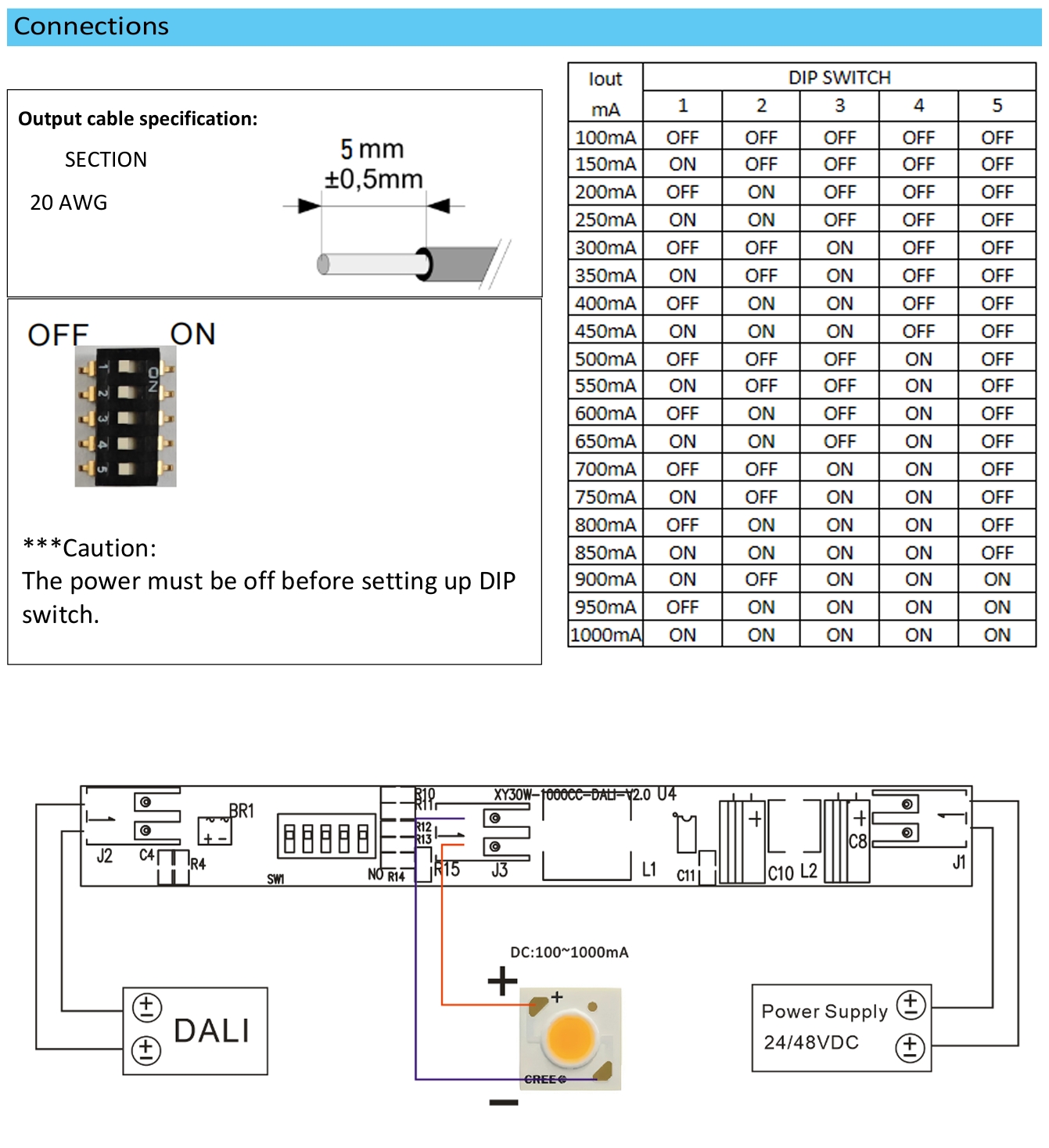 Output constant current could be adjustable from 100mA to 1000mA by DIP switch