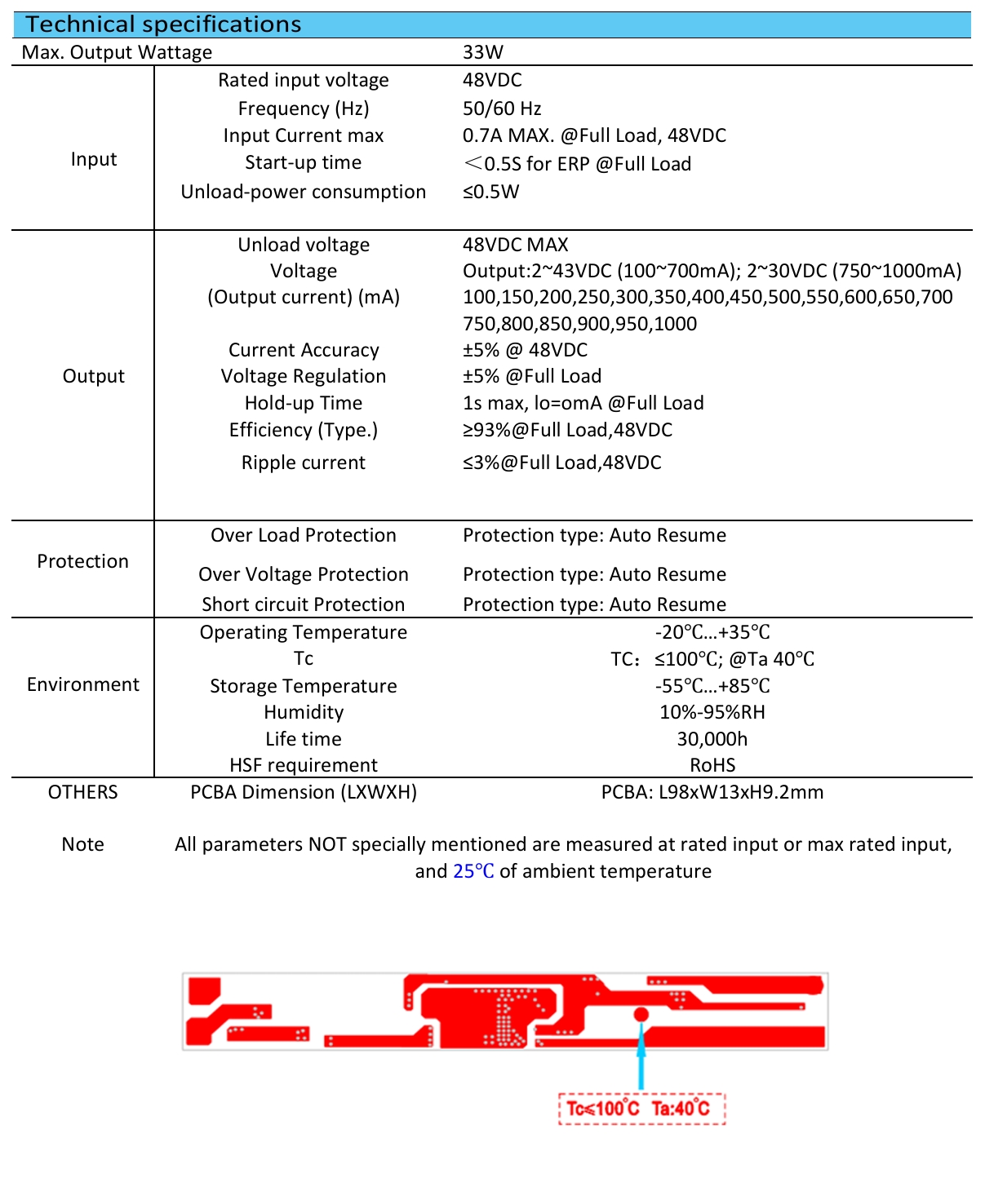 Input voltage 24Vdc - 48Vdc. Output constant current could be adjustable from 100mA to 1000mA by DIP switch No polarized requested for power supply input Output operating voltage 2Vdc to 43Vdc